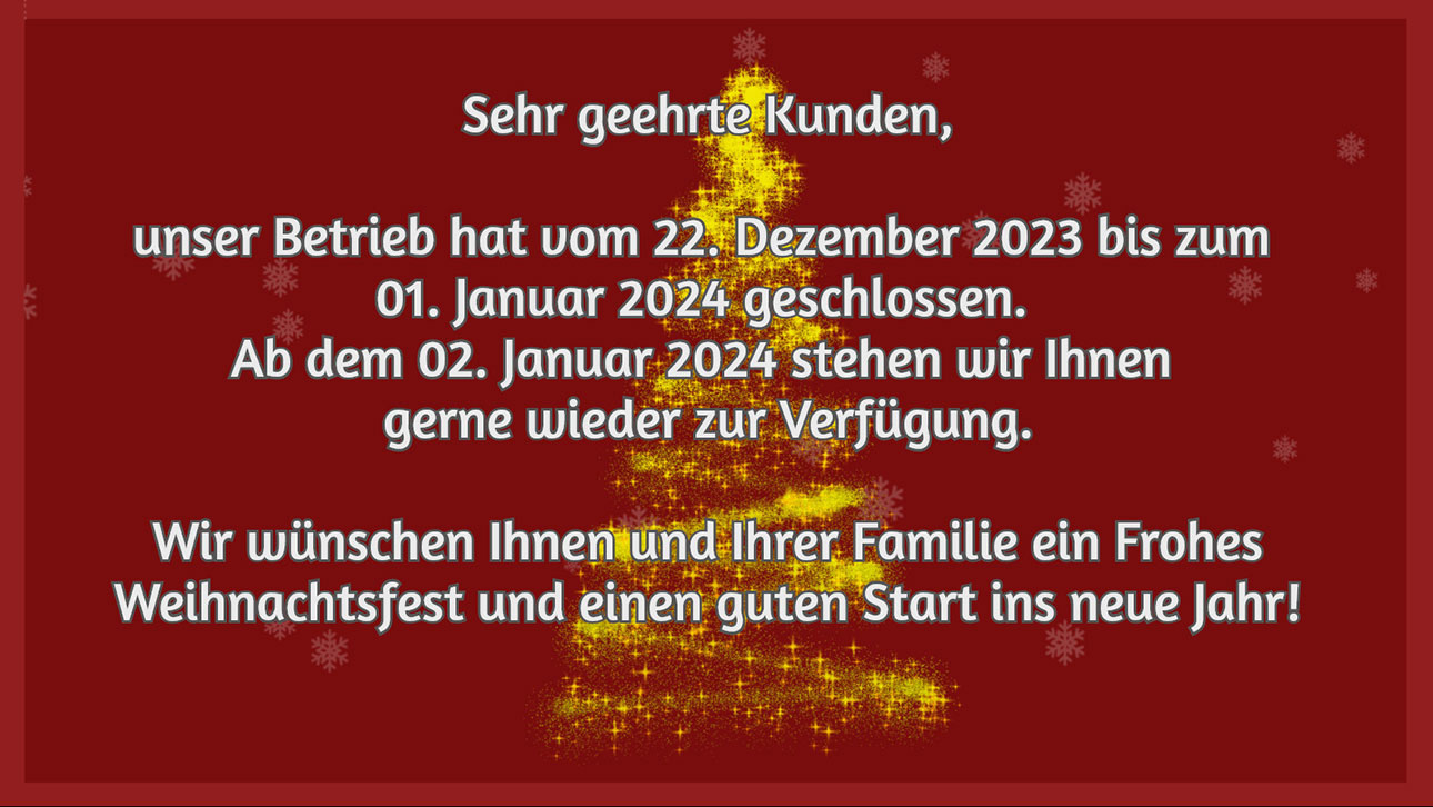 wegen des Brückentags bleibt unser Betrieb am Freitag, 10.05.24, geschlossen. WIr freuen uns wieder ab dem 13.05. auf Sie!