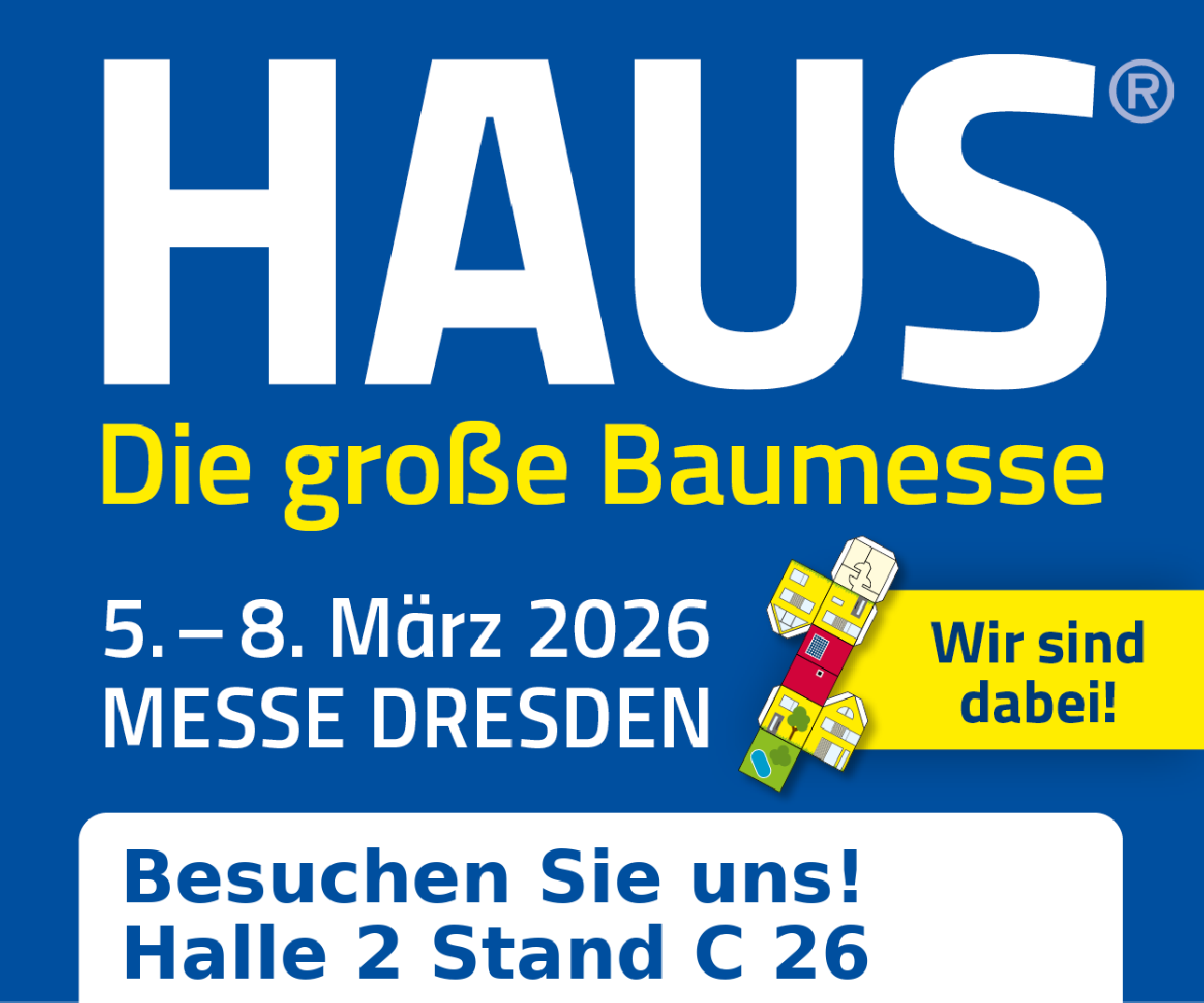 Vom 05. bis 08. März 2026 sind wir wieder auf der Baumesse HAUS auf dem Messegelände Dresden vertreten.