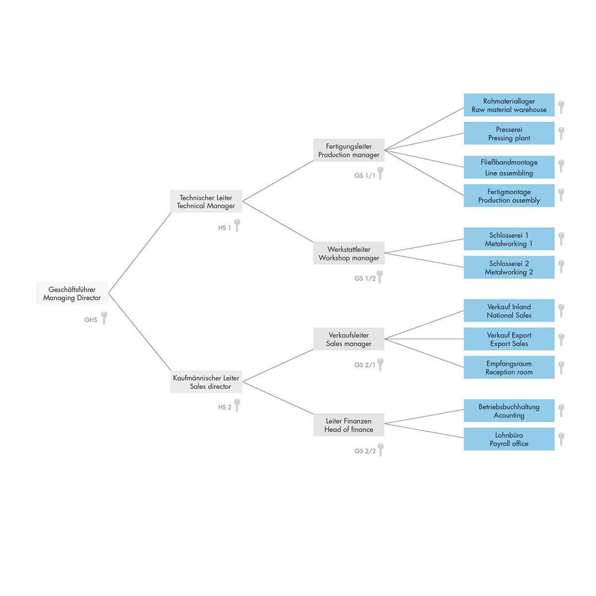 Der Generalhauptschlüssel (GHS) schließt alle Zylinder, der Hauptschlüssel (HS) alle Zylinder eines Hauptbereiches, der Gruppenschlüssel (GS)